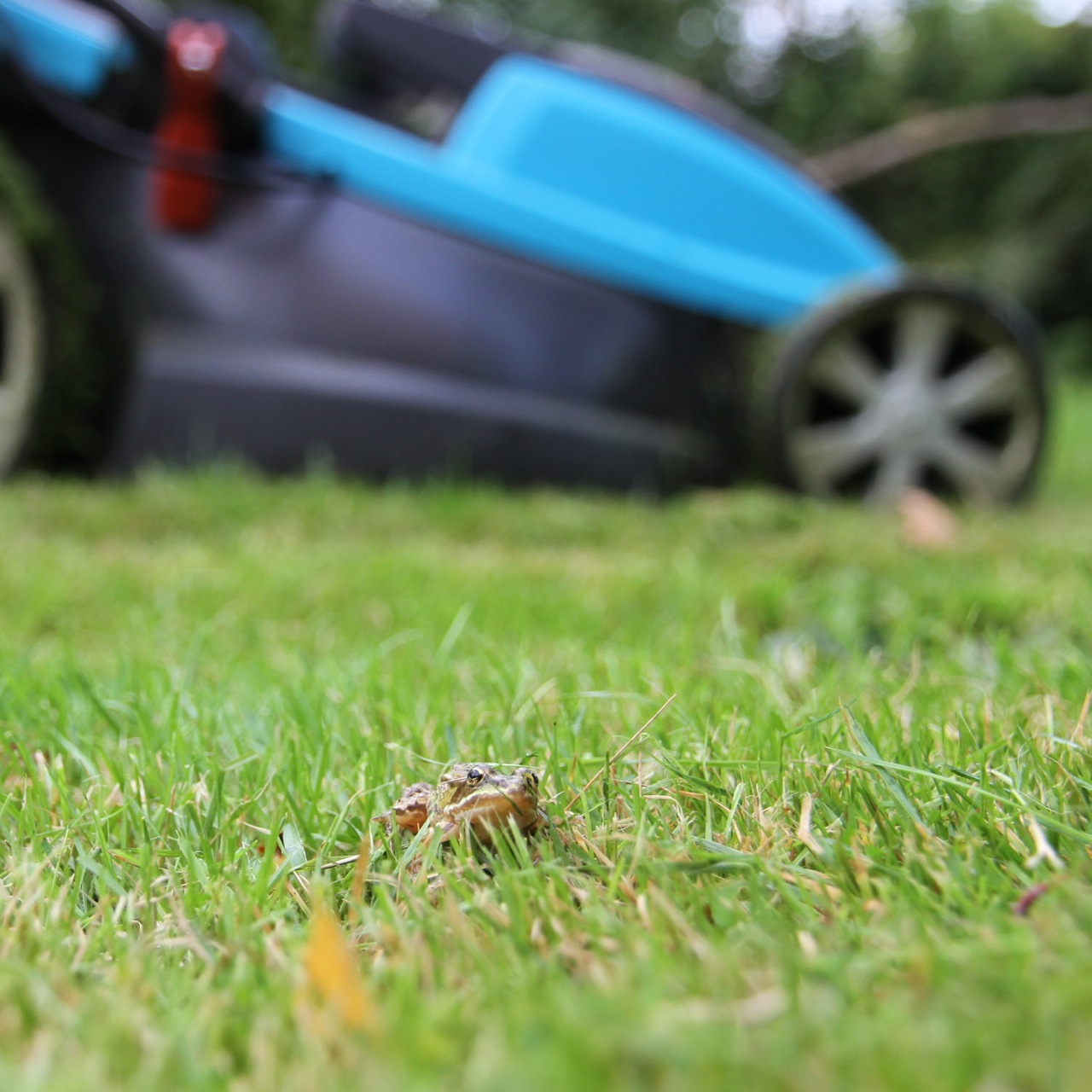 Das Gras abzulaufen vor dem Mähen bringt nicht viel: Die Frösche sind klein – ein Rehkitz fällt bei so etwas eher auf. (Rehkitz, weil man vorm Mähen eines Feldes oder einer Wiese ja übers Feld gehen sollte, um abgelegte Jungtiere zu finden.) Außerdem möchte man den Rasen vorm Schneiden ja nicht unbedingt platttrampeln.