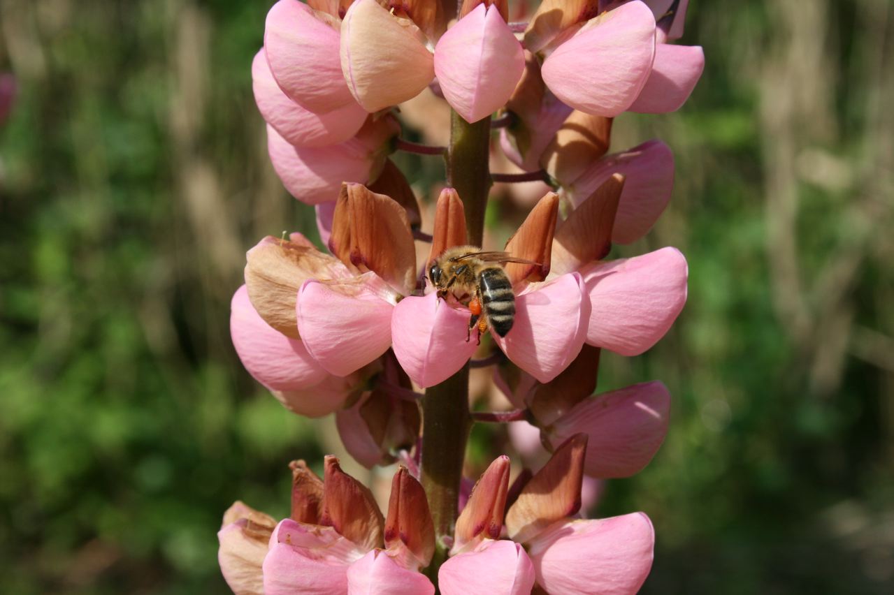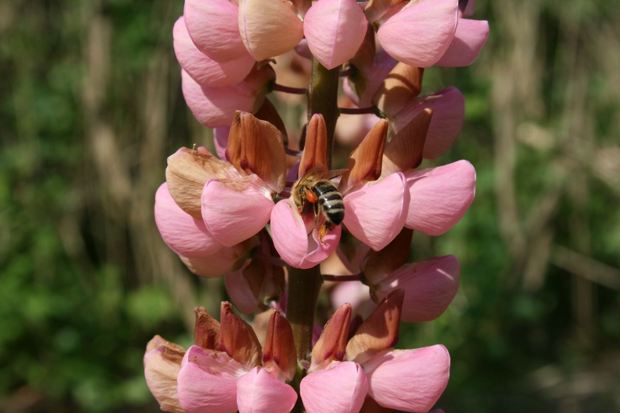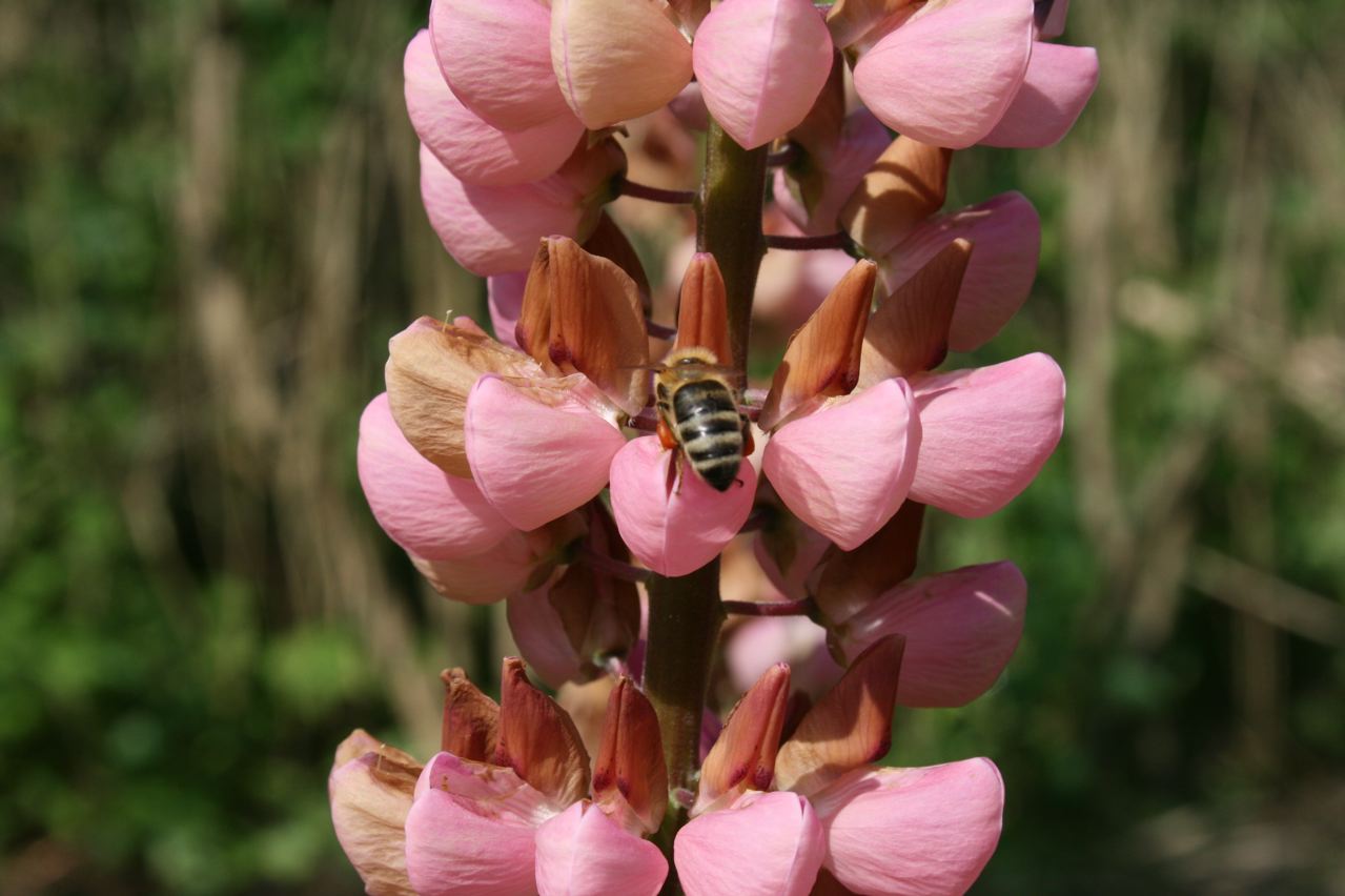 Ich habe mal zugeguckt: Ganz schön viel Arbeit für eine Biene, an die Nahrung in der Lupinenblüte zu kommen. Die Hummeln nebenan waren viel schneller. Vielleicht weil sie dicker und schwerer sind und so die Blüten leichter aufdrücken?