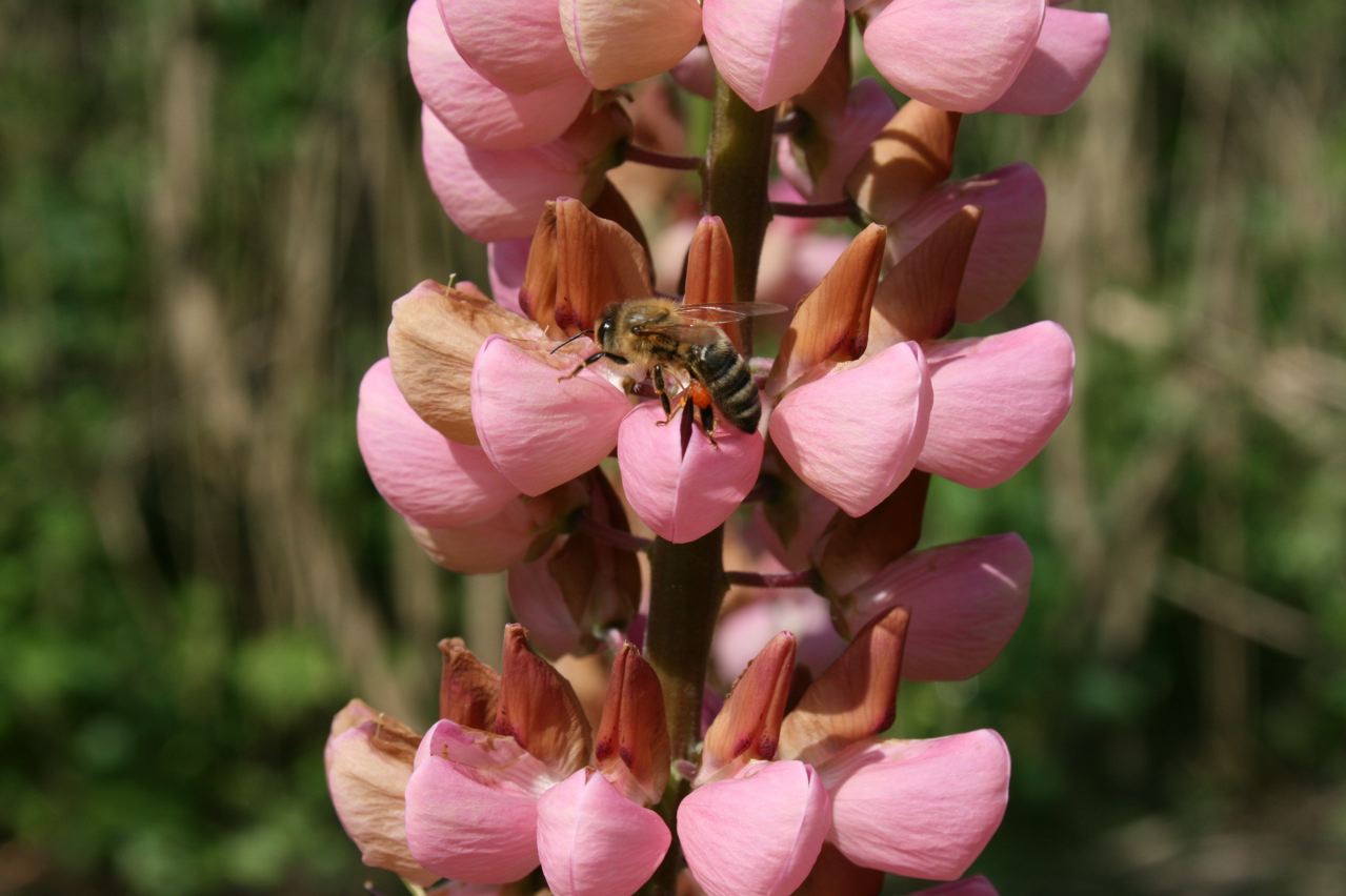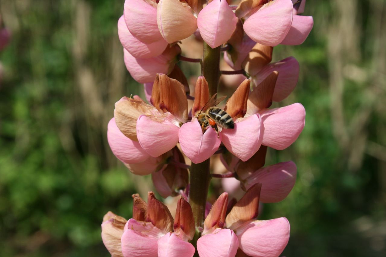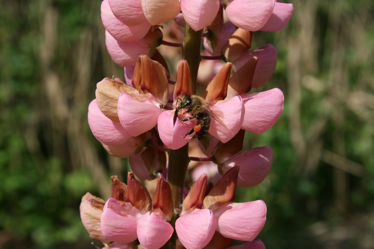 Ich habe mal zugeguckt: Ganz schön viel Arbeit für eine Biene, an die Nahrung in der Lupinenblüte zu kommen. Die Hummeln nebenan waren viel schneller. Vielleicht weil sie dicker und schwerer sind und so die Blüten leichter aufdrücken?
