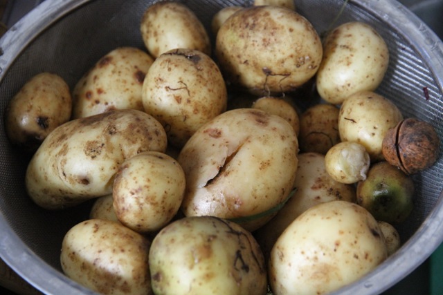 Also habe ich heute eine Regenpause genutzt und eine halbe Stunde gehackt, gewühlt, rausgezogen. Hier Eimer zwei. Leider klebt die Erde sehr an den Wurzelballen, aber das ist nun einmal so. Aber dann hing plötzlich etwas ganz anderes an meiner Hacke, und ich war echt erstaunt: eine faustgroße, formschöne Kartoffel!
