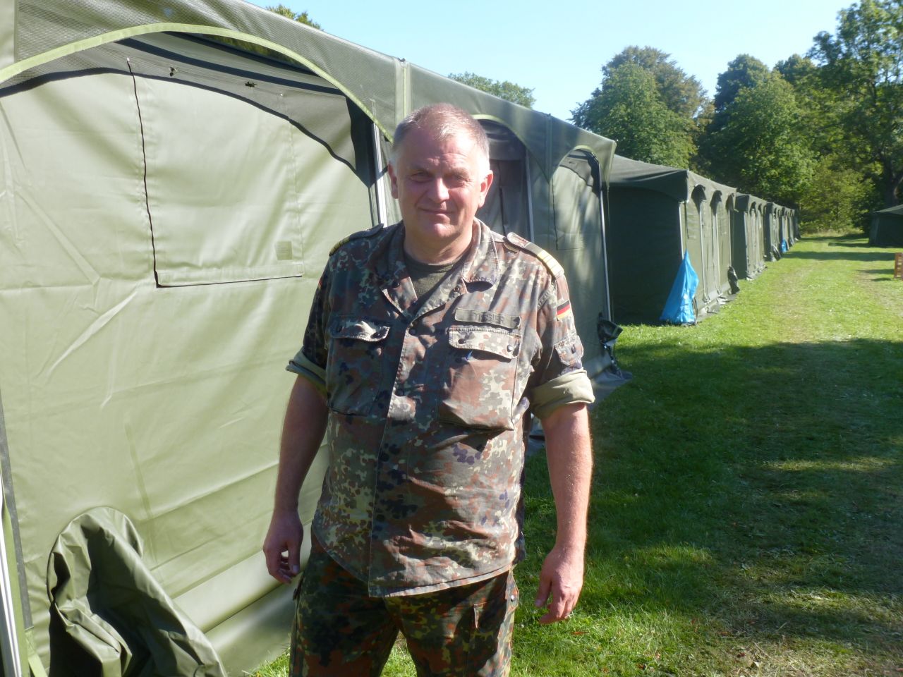 Während ich diesen Artikel schreibe, klingt es, als würde um die Ecke ein Segelschiff aufgetakelt. Rufe, Klirren, lautes Schlagen… sind aber nur die Bundeswehrsoldaten, die rund 100 Meter von mir weg weitere Zelte für Flüchtlinge aufbauen. 35 sollen es heute Abend sein, 41 sollen es werden. Ursprünglich hieß es 42, aber bei einem hätten sie zu viel von einem der großen Bäume wegnehmen müssen. Außerdem wussten die Architekten, die den Aufbau planten, nichts von einem Graben, der Platz wegnimmt. Und ein Zelt braucht immerhin 40 qm.