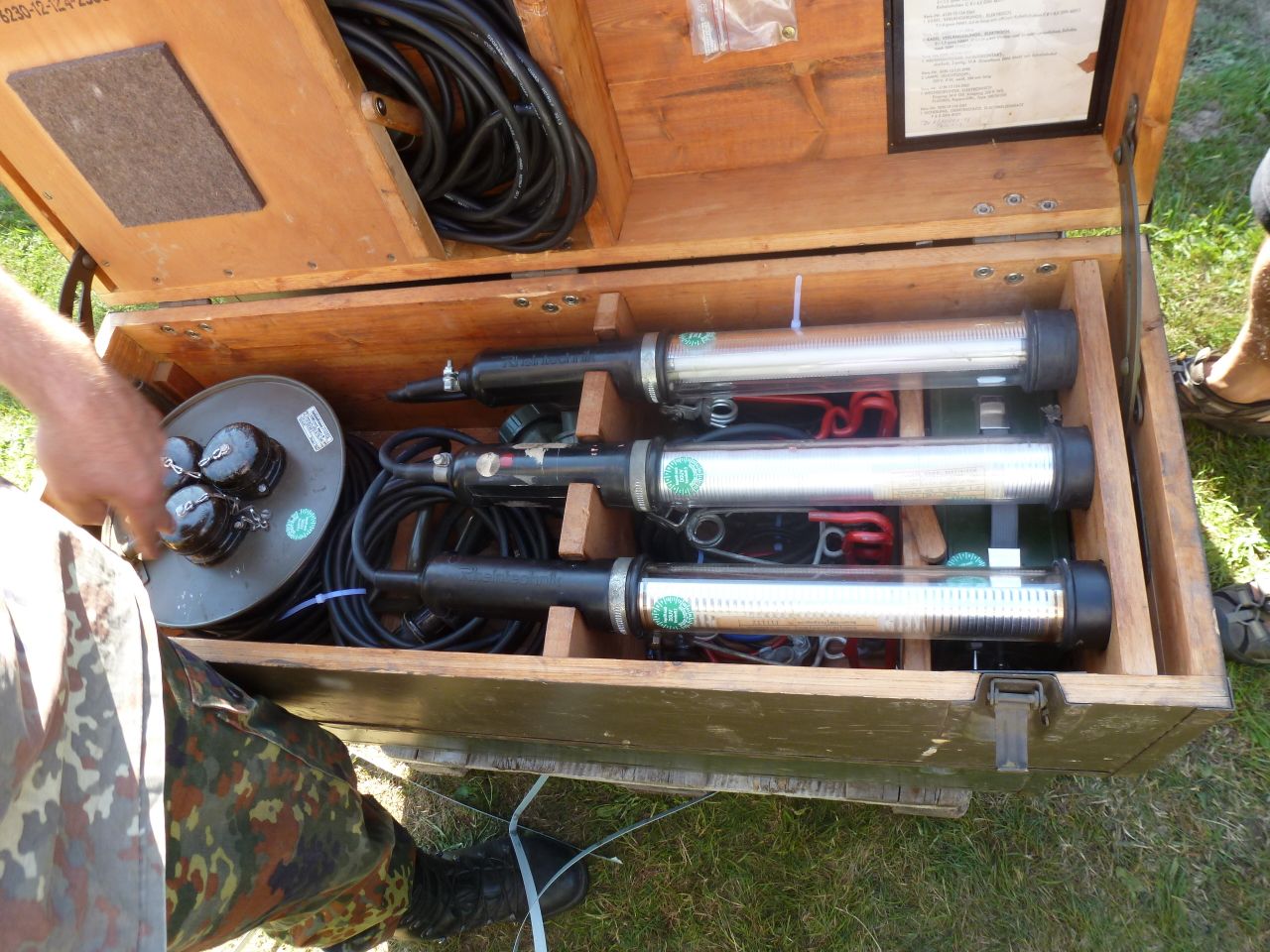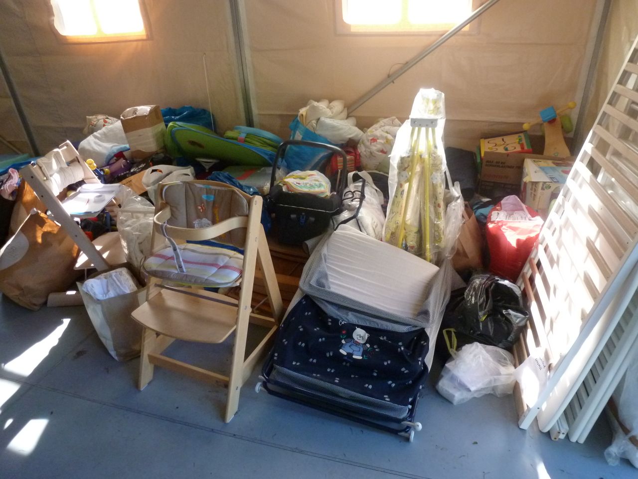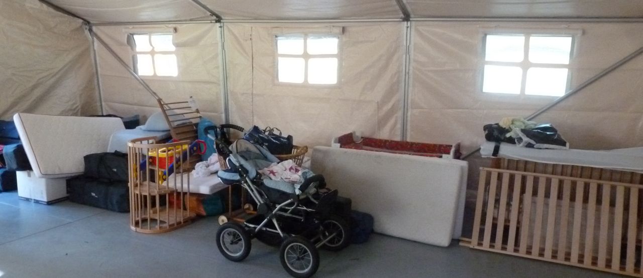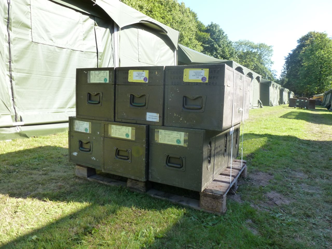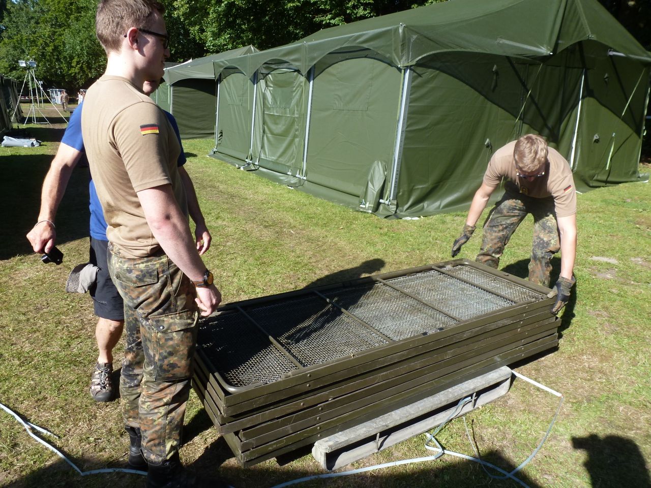 Heute wurden Feldbetten in die Zelte verteilt, aber noch nicht aufgestellt. Die Bundeswehr will schlicht ihre Transportmittel geleert haben. Die Betten sind schwer und stammen noch aus alten NVA-Beständen. Für Detailverliebte: Material wie dieses wird in einem alten Stollen in Brandenburg gelagert.