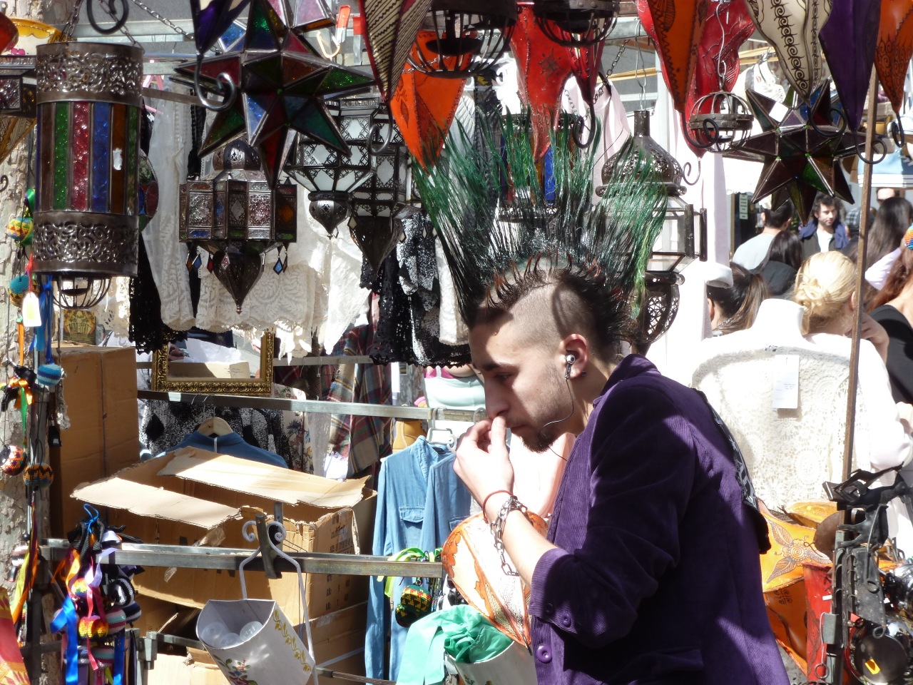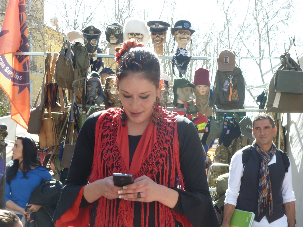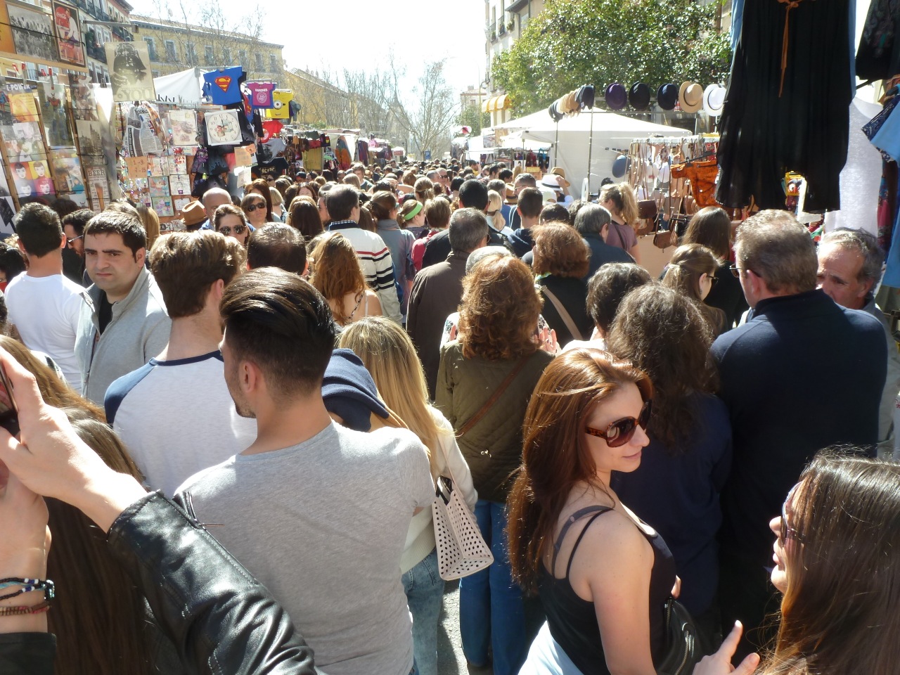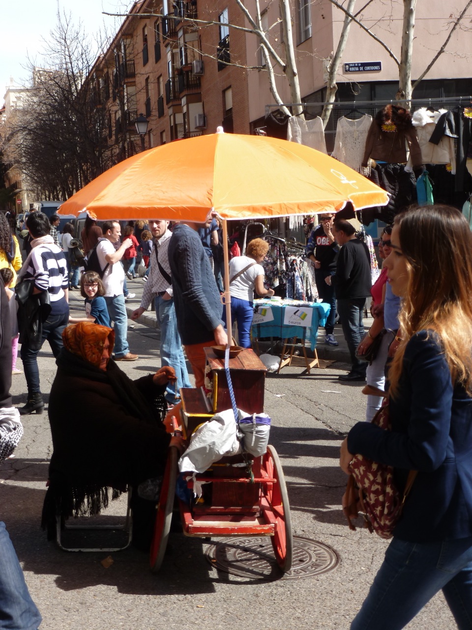 Jeden Sonntag gibt es in Madrid einen großen Straßenflohmarkt mit einer weiten Bandbreite von Billigkrams über Themen-T-Shirts und Skurrilitäten bis hin zu Antiquitäten. In freien Ecken (davon bleiben nicht viele) stehen Bands, hier und da eine lebende Statue oder jemand tanzt. Wir waren am ersten warmen Wochenende des Jahres (im März) dort, es war voll, voll, voll.