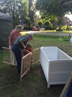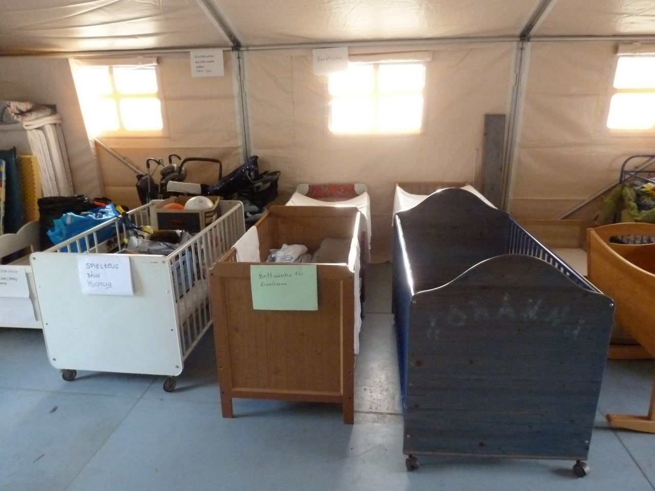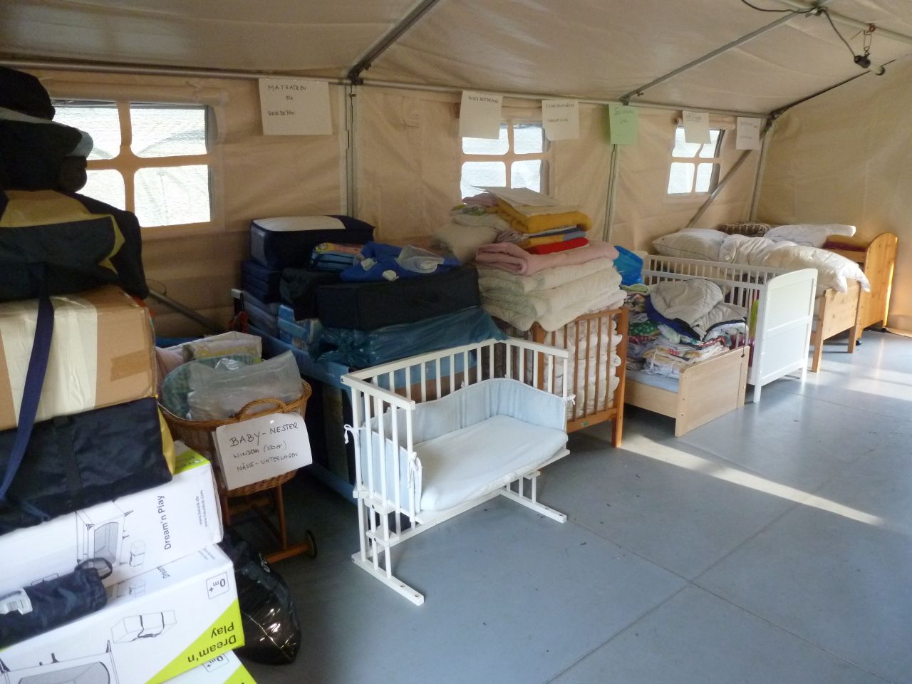 Noch sind die Zelte allerdings fast leer, zumindest wohnen keine Menschen drin. Nur ein Zelt ist sehr voll: Darin sind die Spenden der Ohlstedter Bürger – und sicher auch von Bürgern aus anrainenden Stadtteilen. Wahnsinn! 70 Kinderreisebetten gab es heute Nachmittag, 13 feste Kinderbetten, 3 Wiegen und Zustellbetten. Dazu Matratzen, Kinderschlafsäcke, Decken, Kissen… Listen anbei. Viele Kinderreisebetten sind sogar neu, weil einige losgefahren sind, um sie mal eben zu kaufen. Das ist sehr großzügig.
