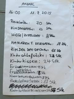 Heute mussten leider einige Spendenwillige wieder weggeschickt werden. Das tut natürlich weh und wirkt auch irgendwie doof. Tatsache ist aber: Noch gibt es keinen Platz für Kleidung und Kinderspielzeug. Ein bisschen davon war schon angekommen. Ein kleines Bisschen haben wir dabehalten, den Rest auch Richtung Messehallen weitergegeben. Das klingt vielleicht undankbar, aber es geht nicht anders, weil wir die Sachen nirgendwo lagern können. Das Zelt kann nicht dauerhaft als Lager besetzt bleiben, denn dort sollen letztlich Flüchtlinge rein. Im Augenblick können die Betten aber noch darin bleiben. Doch akut ist die dringende Bitte, wenn überhaupt, dann nur Betten zu spenden. Dabei sollte man wissen, dass die Betten eventuell weitergegeben werden – für den gleichen Zweck, aber eben woanders hin.