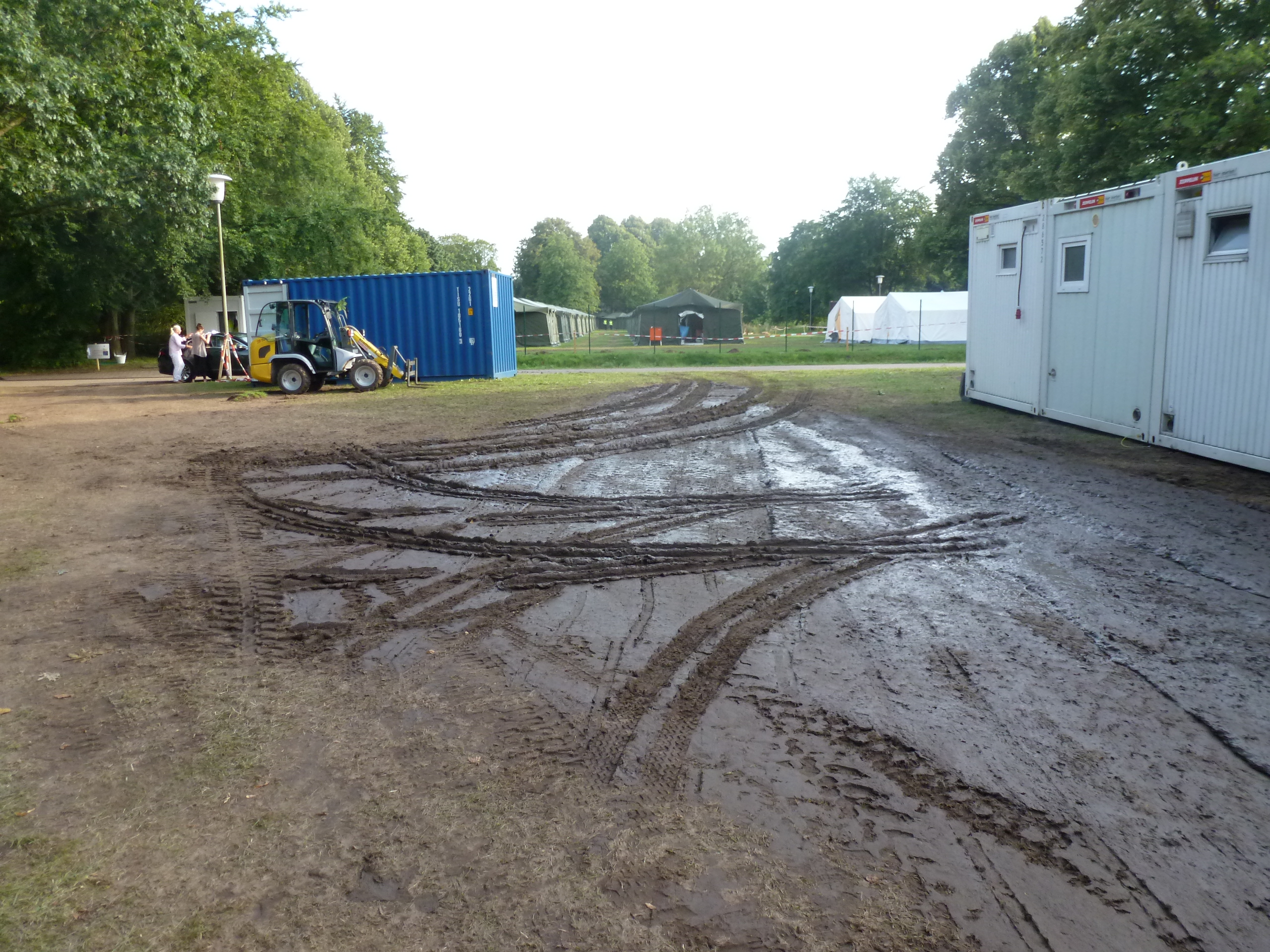 Beim Stichwort Aufregung fällt mir wieder ein, was mich wirklich seit Tagen beschäftigt: die Lage des Platzes. Ich habe ja schon einmal erwähnt, dass es dort eher feucht ist. Der Boden schwingt, wenn man drüber geht. Nachdem es vergangene Nacht so gegossen hat, sieht der Platz auch schon reichlich benutzt aus. Der Rasen löst sich auf – leider nicht in Wohlgefallen, sondern in Matsch. Nun sollen ja die zentralen Wege befestigt werden. Nur glaubt niemand so wirklich dran, dass das hilft. Zumindest nicht von den Ohlstedtern, mit denen ich gesprochen habe. Ein paar Tage Regen und das Wasser drückt auch von unten hoch. Der Garten unseres Hauses ist 100 Meter weiter. Da steht das Wasser in ausdauernden Pfützen wenn es mal eine Woche regnet.