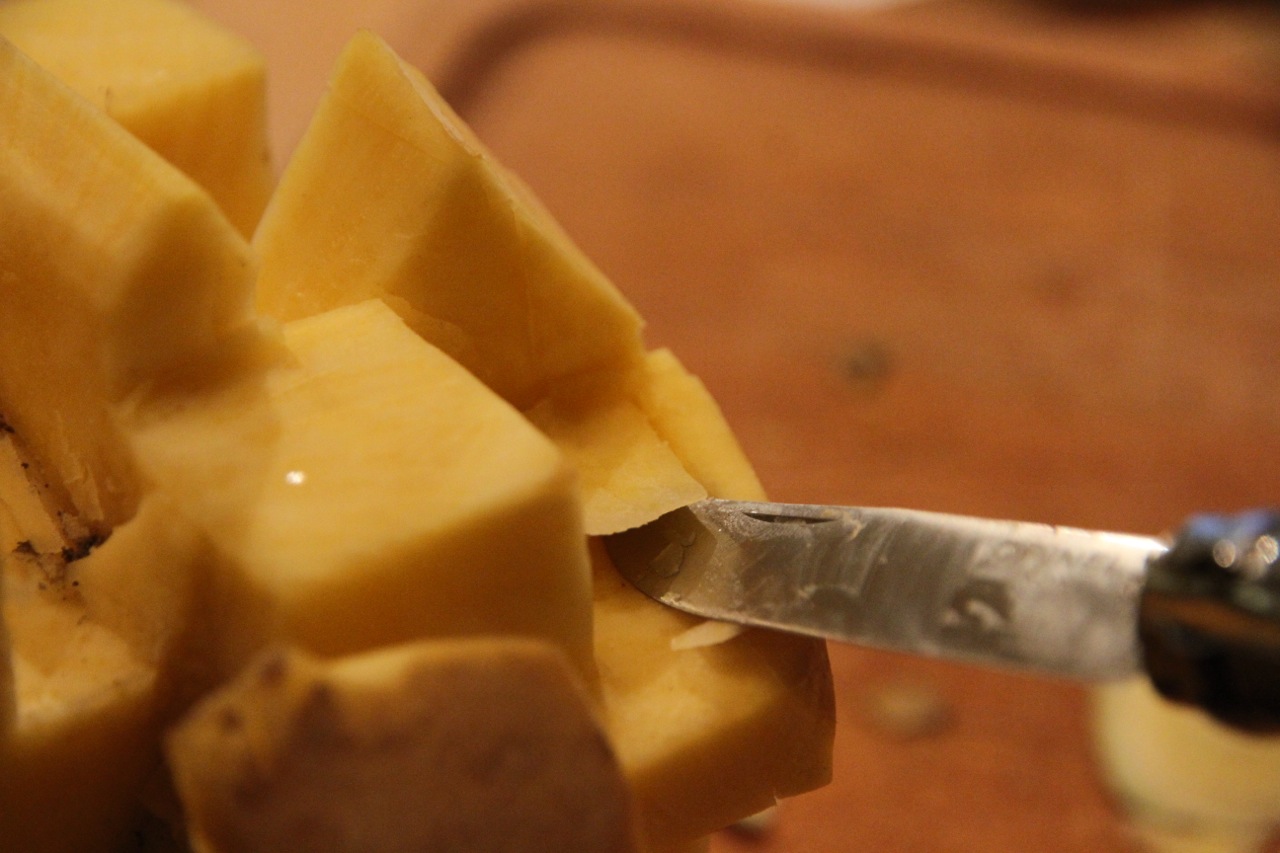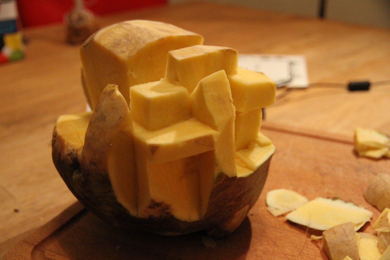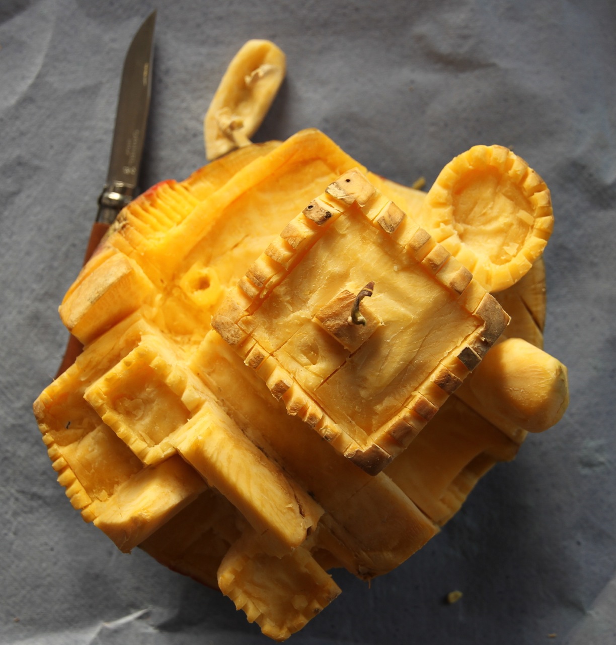 Hier sind schon erste Fenster drin: Ich habe mit der Messerspitze kleine Quadrate gestanzt und die Steckrübenwürfel rausgehebelt. Sie fliegen ganz gut übrigens 😉
