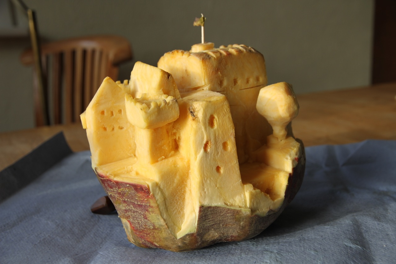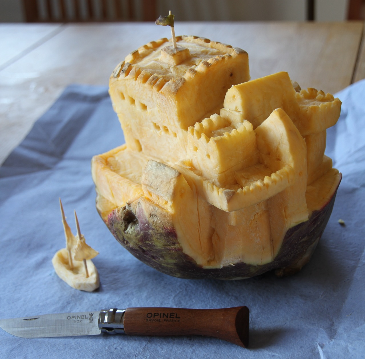 Mit der Zeit wurde die Steckrübe übrigens weicher und wässriger – ohne aber ihre Form zu verlieren. Dennoch musste ich nach vier Stunden zum Ende kommen. Ich habe dann noch ein kleines Schiff geschnitzt und eine feine Fahne und Segel von der Steckrübe gehobelt. Supermesser!