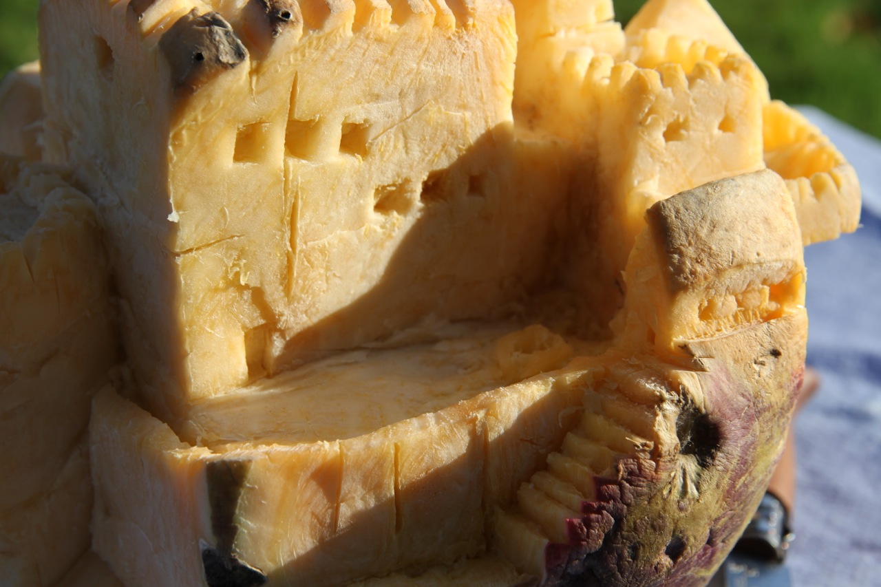 Meine Aufgabe jetzt: Ich sollte etwas schnitzen, im Wettbewerb mit den anderen. Abgesehen von einem Kürbis hatte ich das noch nie gemacht – nur Augen in Radieschen.Und der Kürbis vor Jahren war auch eher ein grobmotorisches Machwerk. Holz kam mir daher zu schwierig vor. Zum Glück durfte es auch ein anderes Material sein. Passend zu meiner Garten- und Kochleidenschaft wählte ich also eine Steckrübe.